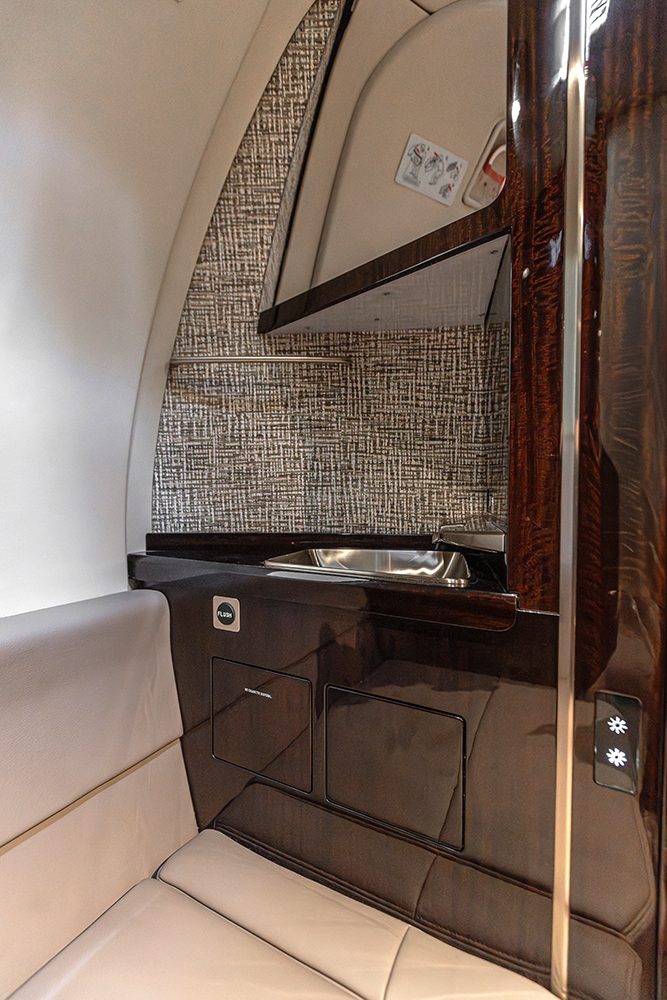 N338HR is configured for 9 passengers via six main cabin pedestal seats, a forward two place side facing divan, and aft lavatory left hand belted seat across from the right hand externally serviced toilet.